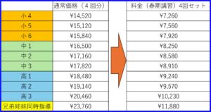 春期講習3回目の授業のときにご持参ください。料金は以下の通りです。(春期講習90分×4回セット)