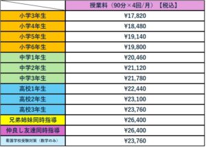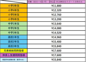 ※兄弟姉妹(2名)同時指導割、仲良し友達同時指導割を適用する場合を除き、授業は全てマンツーマン指導を行います。